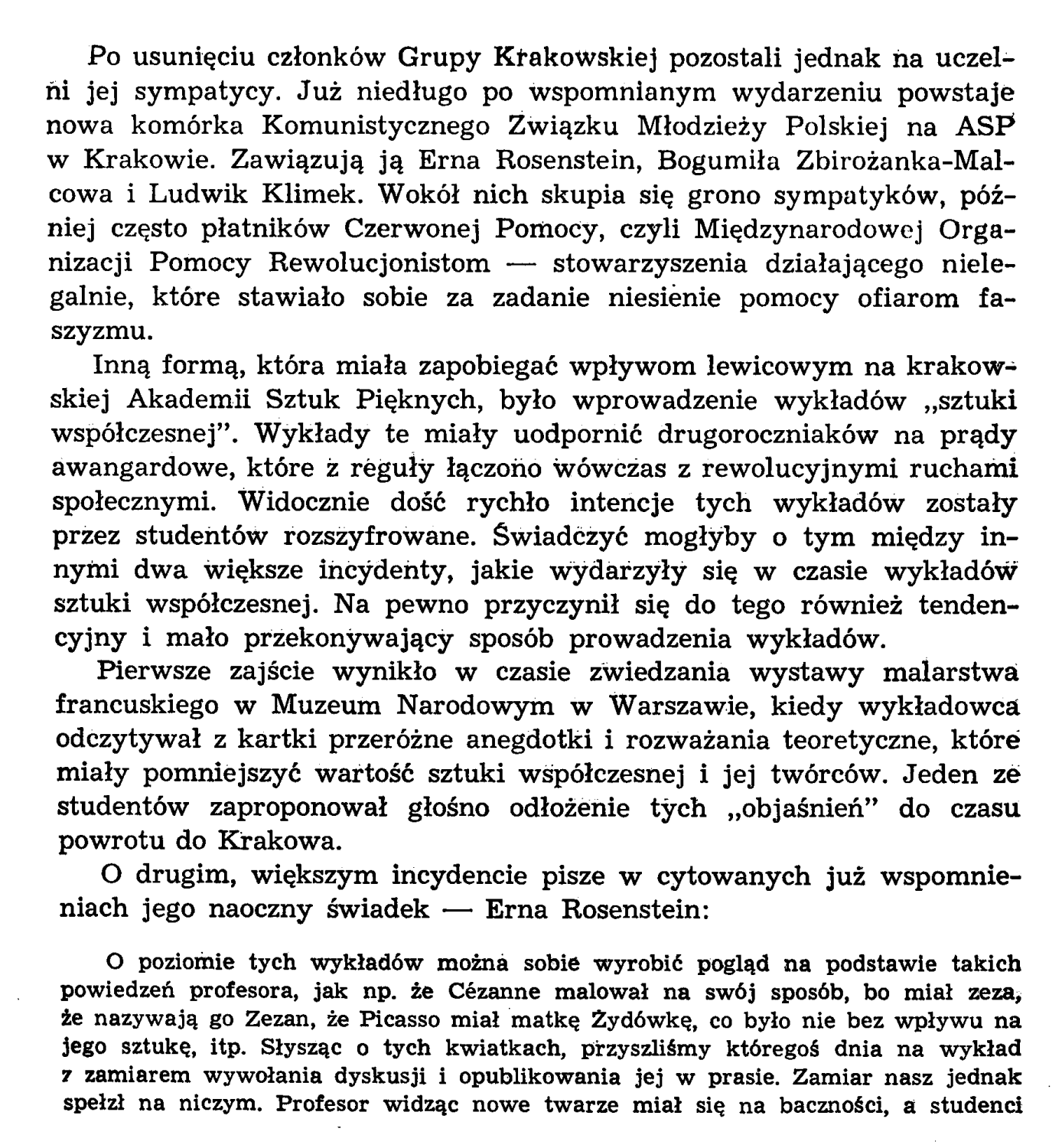 Dla Erny Rosenstein było to bliższe i atrakcyjniejsze od Akademii, gdzie królowały jeszcze wspomnienia i dorobek Młodej Polski czy koloryzm, a awangardę zwalczano. Grono profesorskie, wprowadzając zajęcia ze "sztuki współczesnej" zamierza uodpornić studentów sztuki, na te nowinki. O poziomie wykładów po latach Erna Rosenstein pisała : "....można sobie wyrobić pogląd na podstawie takich powiedzeń profesora, jak np. że Ceznne malował na swój sposób, bo miał zeza, że nazywają go Zezan, a Picasso miał matkę Żydówkę, co było nie bez wpływu na jego sztukę..."