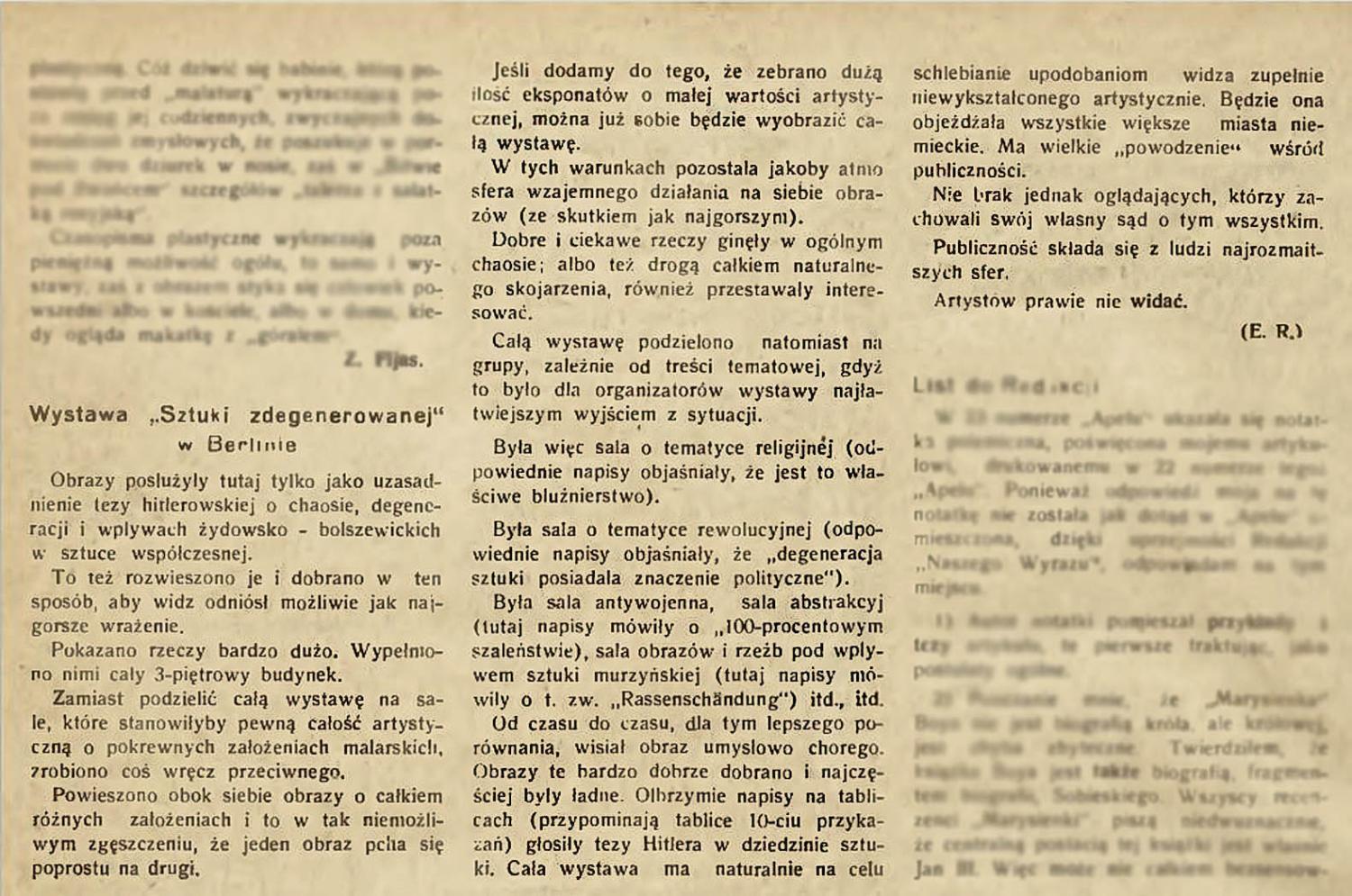 Artykuł Erny Rosenstein pt. Wystawa "Sztuki zdegenerowanej" w Berlinie, to przeoczony czy zapomniany ewenement. Napisany został przez Polkę pochodzenia żydowskiego, wtedy młodą, później b. znaną awangardową malarkę, z propagandowej hitlerowskiej wystawy, którą zwiedza będąc przejazdem w Niemczech.