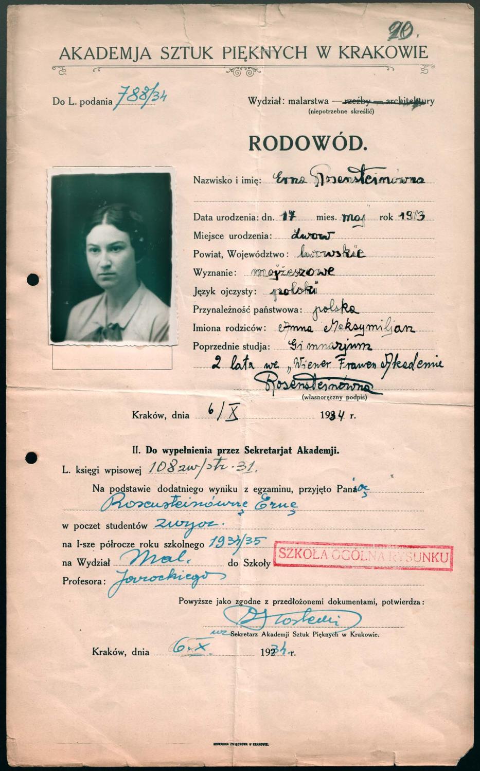 Erna Rosenstein we wrześniu 37 roku powiadomiła uczelnie, ze przerywa studia na Akademii i jedzie na rok do Paryża i do Włoch, uczyć się malarstwa. Czy była to jej własna wola, jak po latach opowiadała, czy też decyzja zniknięcia z uczelni wynikała z obawy o skutki trwającego postępowania dyscyplinarnego, nie wiem i już się nie dowiem.